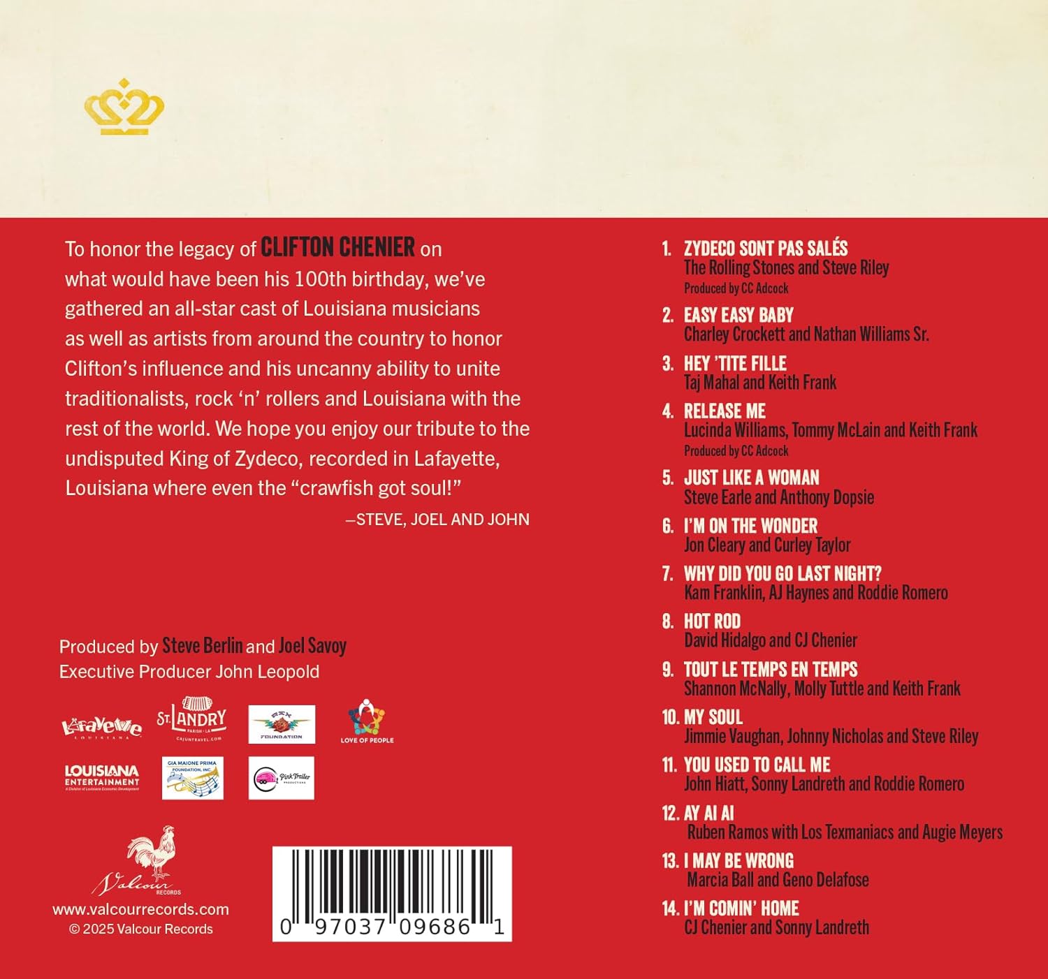 To honor the legacy of Clifton Chenier - AKA The Kingof Zydeco - on what would have been his 100th birthday, we've gathered an all-star cast of Louisiana musicians as well as artists from around the country to honor Clifton's influence and his uncanny ability to unite traditionalists, rock 'n' rollers and Louisiana with the rest of the world. We hope you enjoy our tribute to the undisputed King of Zydeco, recorded in Lafayette, Louisiana where even the "crawfish got soul! A sampling of the artists featured in this tribute: » The Rolling Stones » Steve Earle » Lucinda Williams » Jimmie Vaughan » Taj Mahal » CJ Chenier » John Hiatt » John Cleary » Los Texmaniacs » Geno Delafose » Steve Riley » Marcia Ball » And more!